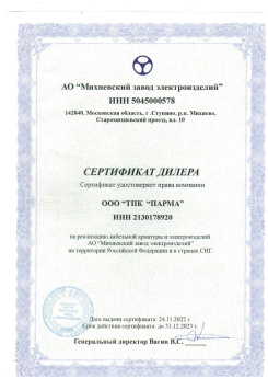 Сертификат удостоверяет права компании ООО "ТПК ПАРМА" на реализацию кабельной арматуры и электроизделий АО "Михневский завод электроизделий" на территории Российской Федерации и в странах СНГ