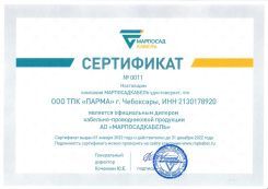 Сертификат удостоверяет, что ООО "ТПК ПАРМА" является официальным дилером кабельно-проводниковой продукции АО "МАРПОСАДКАБЕЛЬ"